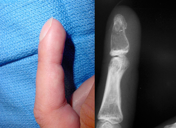 A 38-year-old woman presents with mild swelling and occasional discomfort in her left index finger for the past 6 months. She denies any trauma, fever, or constitutional symptoms. On examination, there is a firm, non-tender swelling over the distal phalanx. There is no redness or warmth. X-ray of the hand is shown below.