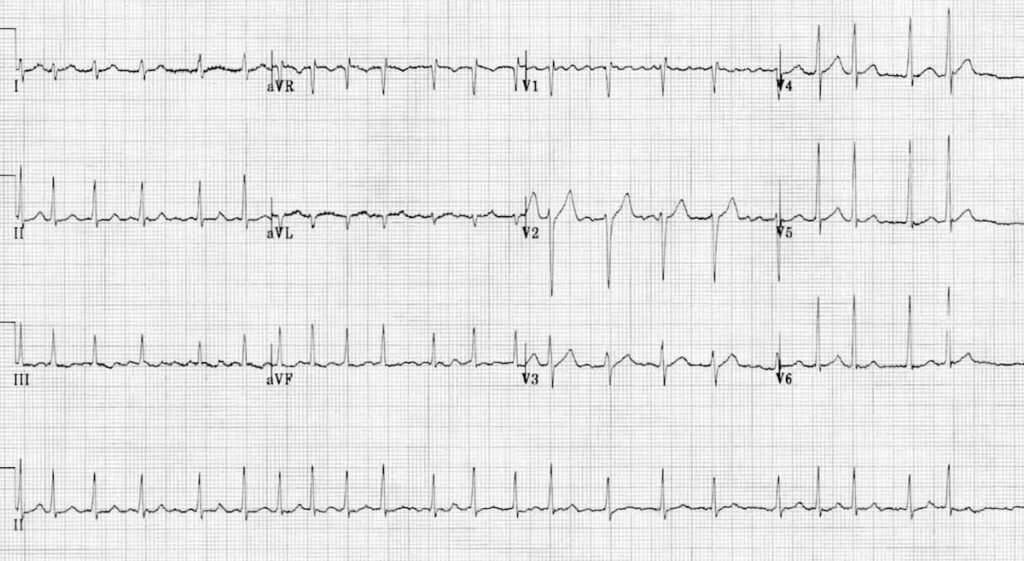 A 72-year-old woman presents to the clinic with complaints of intermittent palpitations and mild shortness of breath over the past month. She denies chest pain or syncope. On examination, her pulse is irregularly irregular with a rate of about 110 bpm. Blood pressure is 130/80 mmHg. An ECG is obtained as is as follows;